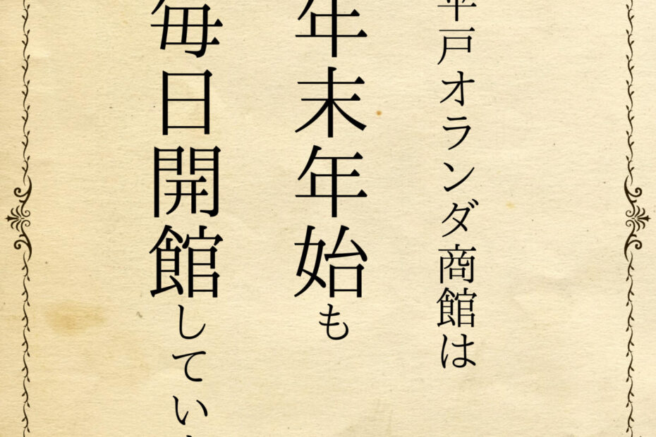 年末年始、毎日開館しています!2025年12月28日2025年12月28日お知らせ, 緊急のお知らせ平戸オランダ商館は、年末年始も休みなく開館しております。 ぜ… 続きを読む »年末年始、毎日開館しています!
