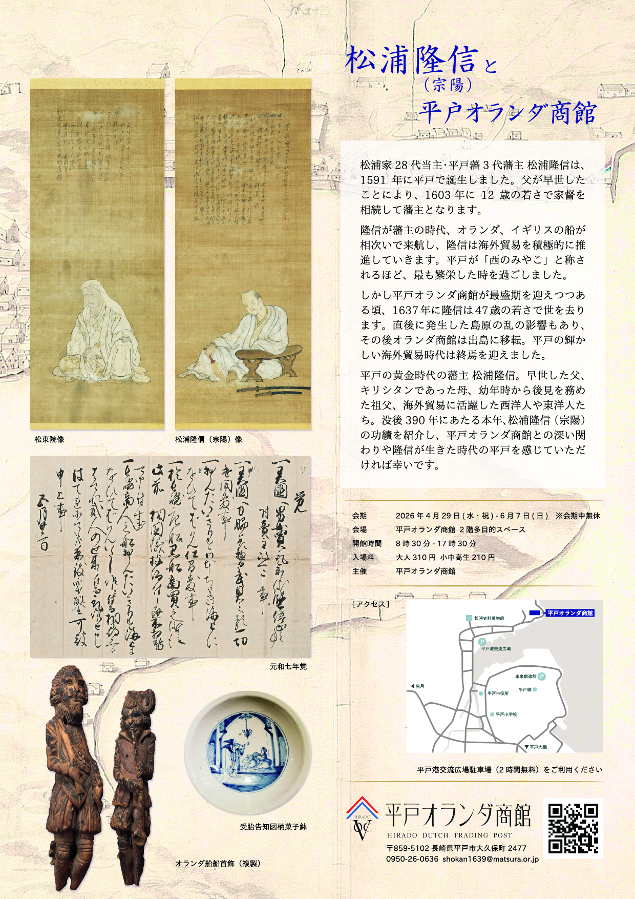 平戸の黄金時代の藩主 松浦隆信。早世した父、キリシタンであった母、幼年時から後見を務めた祖父、海外貿易に活躍した西洋人や東洋人たち。没後390年にあたる本年、松浦隆信(宗陽)の功績を紹介し、平戸オランダ商館との深い関わりや隆信が生きた時代の平戸を感じていただければ幸いです