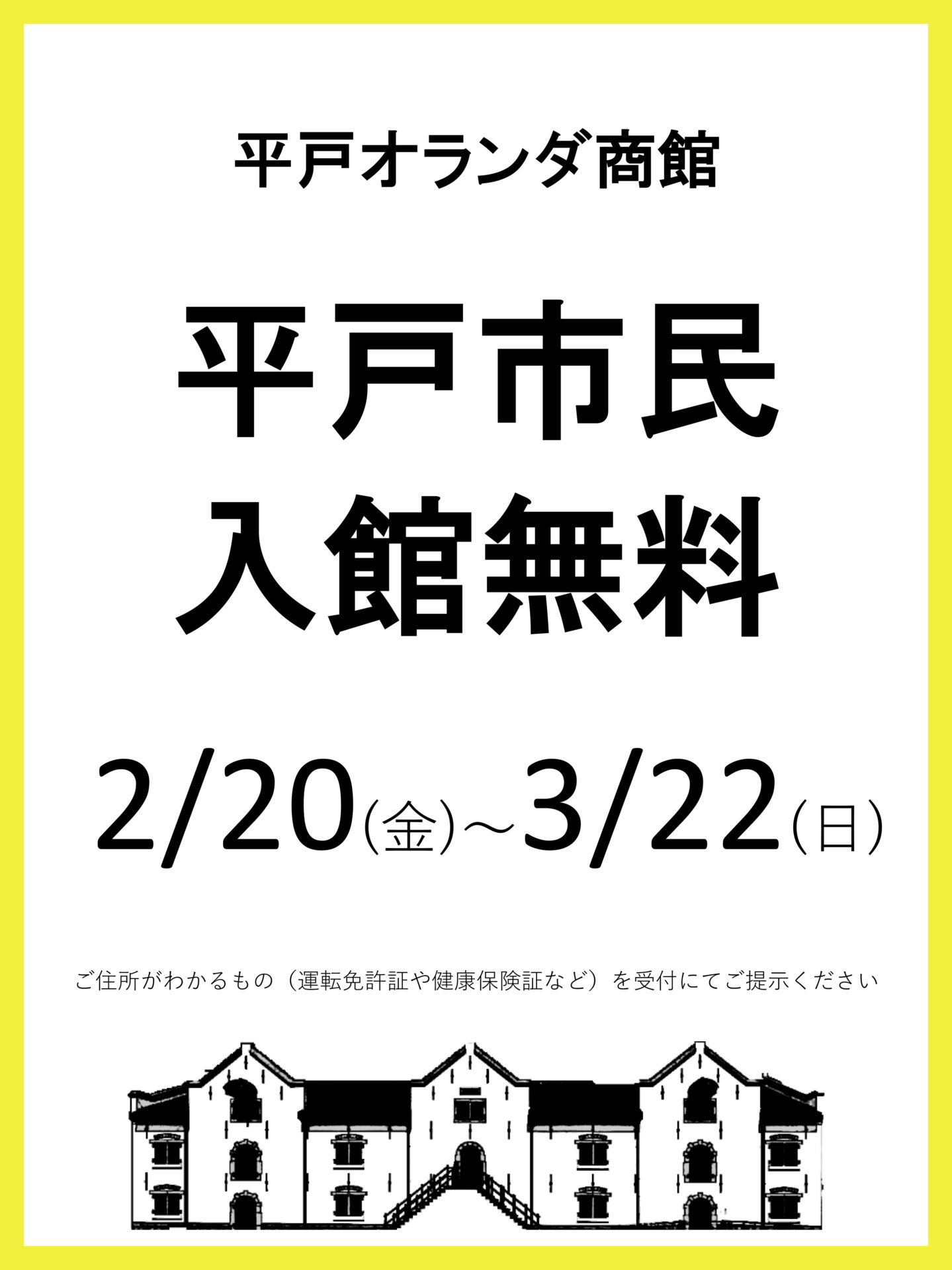 平戸市民入館無料 2/20~3/222026年2月3日お知らせ, 緊急のお知らせ平戸市民入館無料月間のお知らせ 期間:2026年2月20日(金)~3月22日(日) ご住所がわかるもの(運転免許証や健康保険証、学生証など)を受付にてご提示ください。