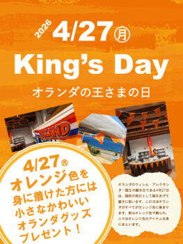 King’s Day 王様の日2026年4月20日2026年4月20日お知らせ, 緊急のお知らせ4月27日はKing’s Day オランダの王様の日です! オランダのウィレム・アレクサンダー国王の誕生日である4月27日は、国民の祝日として国をあげて盛大に祝います。この日はオランダのすべてがオレンジ色に染まります。街はオレンジ色で飾られ、人々はオレンジ色のアイテムを身にまといます。 4月27日(月)には、オレンジ色を身に着けた方に小さなオランダグッズをプレゼント!